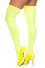 My oh my! Our sassy thigh highs are the perfect accessory to set off any ensemble. Thicker than your basic thigh high and edgier than regular leggings, these wet look thigh highs are definitely daring. Featuring a stay put double stitched top and curve hugging full footed legs. Durably made from high quality wet look spandex.
